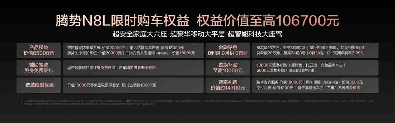 騰勢N8L售價為29.98萬元-32.98萬元,上市以來持續熱銷,為回饋用戶厚愛,推出限時購車權益,價值最高達10.67萬元!包括價值1.7萬元的三年免息,最高1萬元的置換補貼。此外,在2025年11月30日24點前完成合同簽署的用戶,如果因非用戶原因車輛未及時交付,導致開票實際發生在2026年,可享受購置稅差額補貼,最高1.5萬元!用戶不必擔心因為交車晚,而享受不到購置稅補貼。