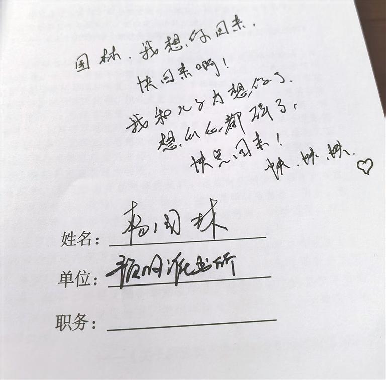 預旺派出所的辦公室里,楊國林辦公桌上的筆記本碼得整整齊齊,翻開扉頁,幾行娟秀卻帶著顫抖的字跡刺得人眼睛發澀:“國林,我想你回來?;貋戆。∥液蛢鹤犹肽懔?,想得心都碎了,快點回來!快快快。”
