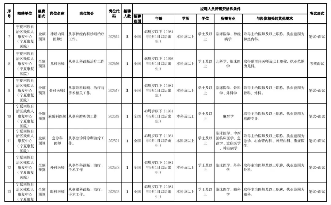 《寧夏回族自治區(qū)殘疾人康復(fù)中心(寧夏康復(fù)醫(yī)院)2025年自主公開招聘事業(yè)單位工作人員公告》已于2025年9月26日發(fā)布。因部分崗位報(bào)名審核通過(guò)人數(shù)未達(dá)到開考比例或無(wú)人報(bào)考,經(jīng)自治區(qū)殘聯(lián)自主公開招聘事業(yè)單位工作人員領(lǐng)導(dǎo)小組研究,現(xiàn)對(duì)部分崗位(崗位代碼:202501、202503、202504、202507、202510、202513、202414、202516、202517、202519、202521、202523、202525、202527、202529)年齡、學(xué)歷等資格條件進(jìn)行調(diào)整(具體情況詳見附件1),報(bào)名時(shí)間進(jìn)行延長(zhǎng):