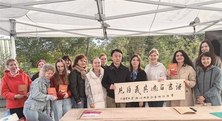 張學(xué)東(中)在俄羅斯舉辦讀者交流活動。受訪者供圖