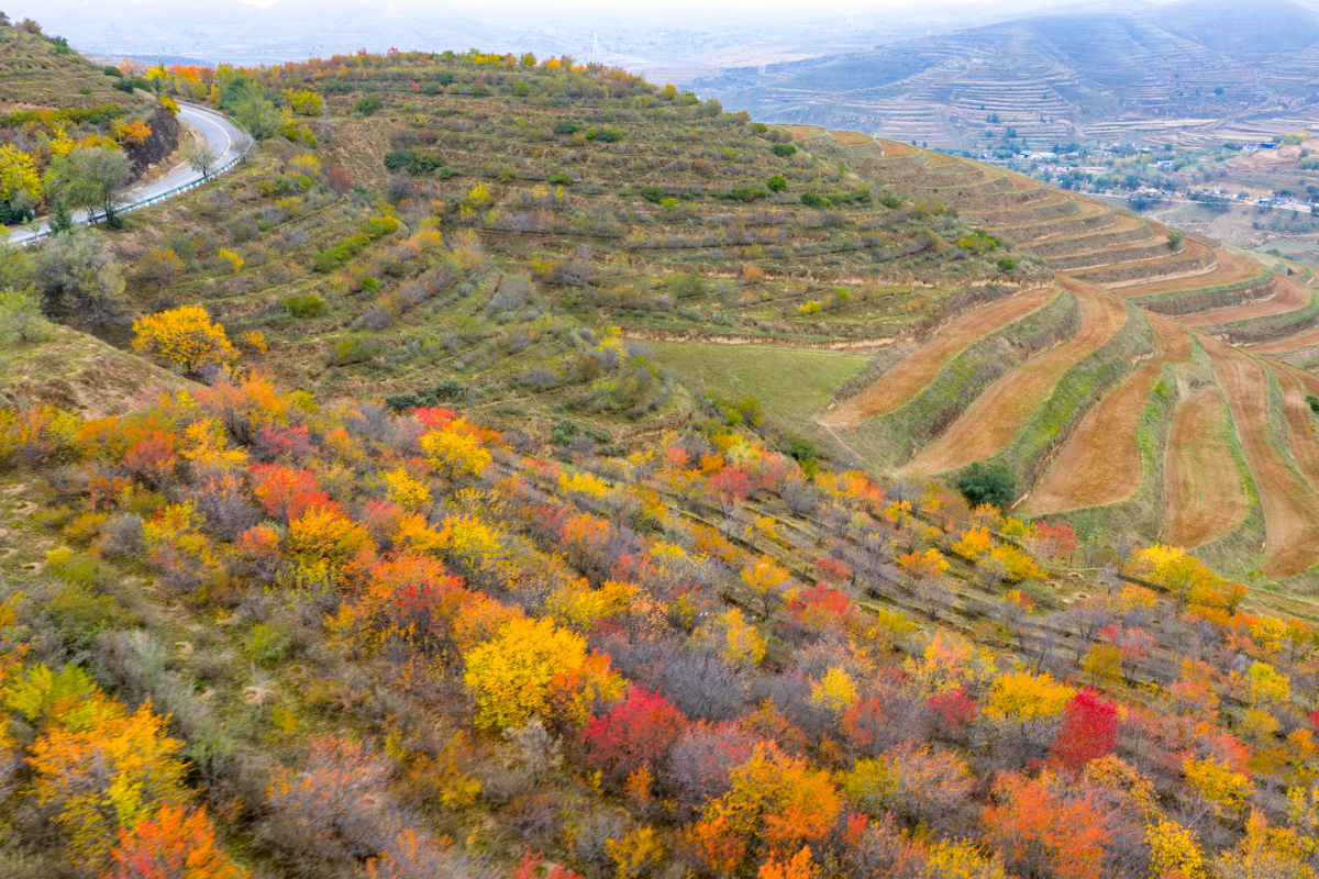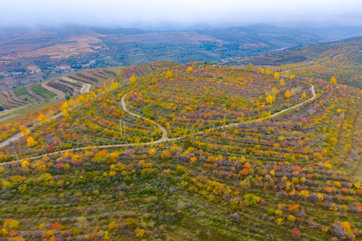 深秋時節,寧夏西吉縣興平梁宛如一幅絢麗的畫卷。蜿蜒的公路盤旋在五彩斑斕的山坡間,樹木像是被打翻的調色盤,染上了金黃、橙紅等色彩。遠處,層層梯田與山巒相依,湖水如鏡點綴其間。云霧繚繞下,這里靜謐而壯美,每一處風景都訴說著秋日的浪漫與詩意,令人心醉神迷。 寧夏新聞網記者 祁瀛濤 攝