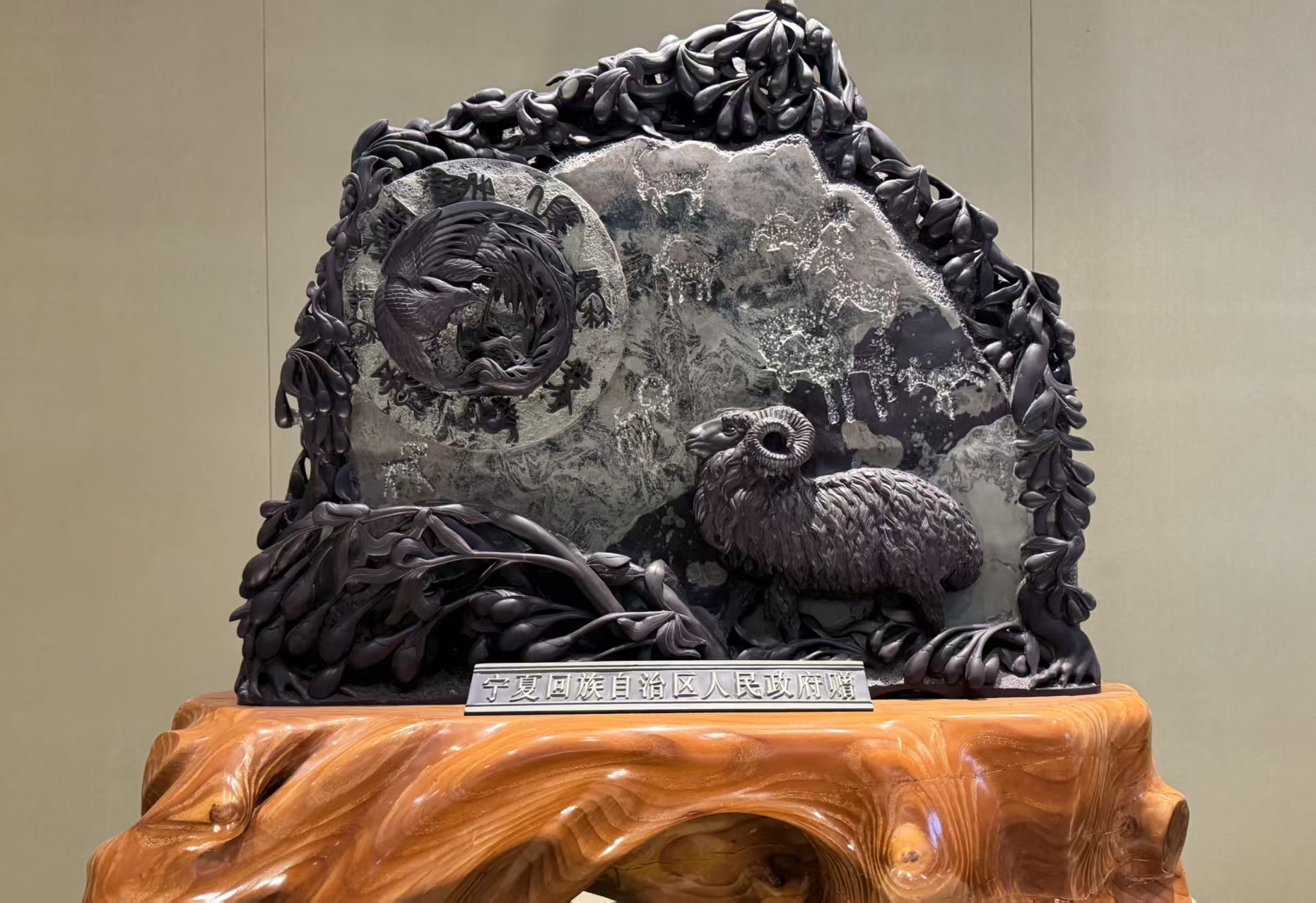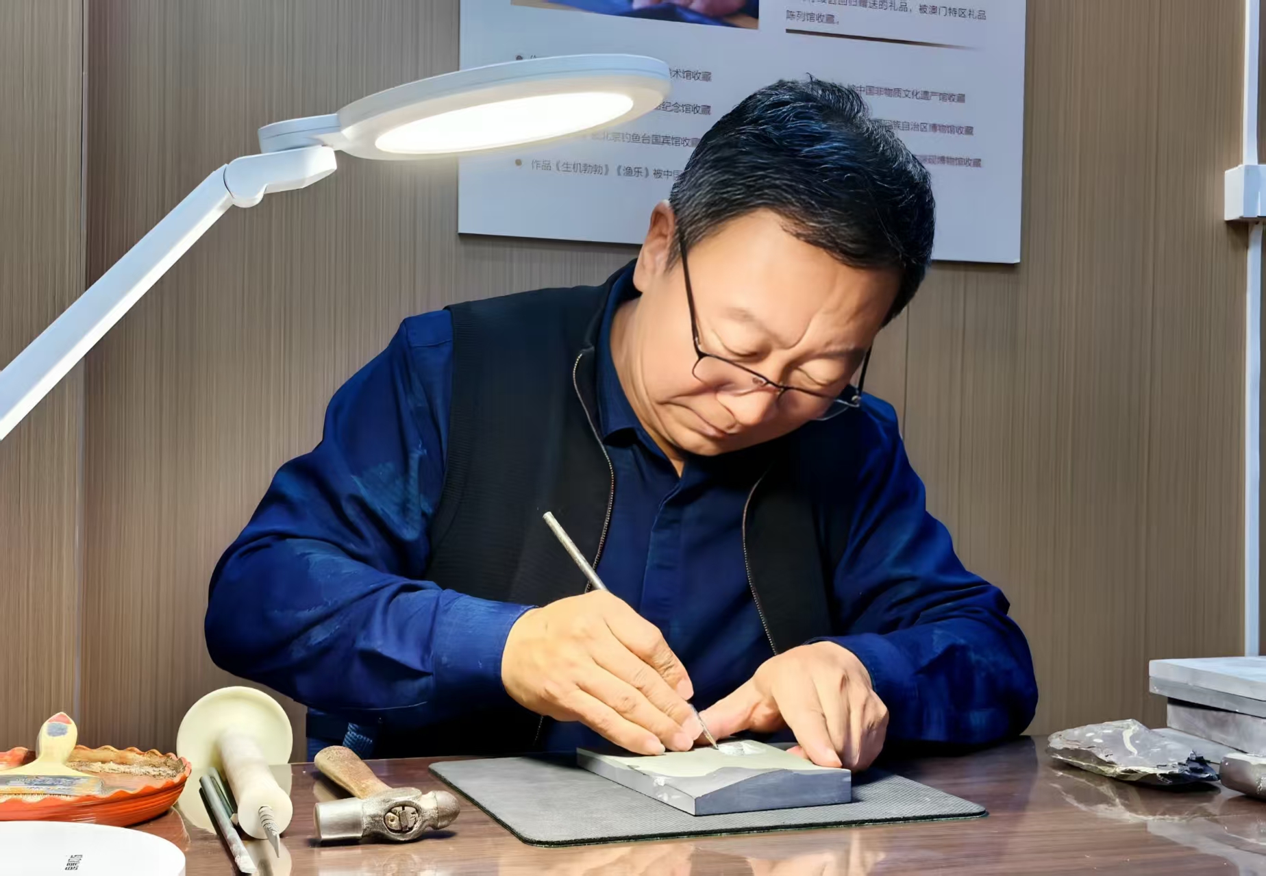 11月14日,記者走進寧夏地質博物館。在這里,時光仿佛在刀鋒與石面的輕觸間放緩了腳步。中國工藝美術大師、寧夏地質局“塞上工匠”石飚俯身于工作臺前,手中的刻刀如筆,在紫瑩瑩的賀蘭石上輕盈游走。石屑如同時光的碎屑悄然剝落,一方頑石的命運正在被重新定義。這精妙絕倫的瞬間,其源頭可追溯至三十六年前那個火光躍動的夏天。