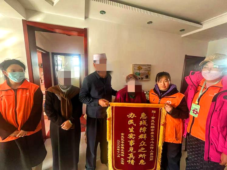 幫扶過程中,細心的小馬發現王奶奶下肢障礙約五年卻未辦理肢體殘疾證,可能影響福利政策享受。在征得同意后,小馬積極協調辦理流程。11月14日,項目組派出精康流動服務車,全程接送王奶奶前往自治區人民醫院完成殘疾評定。評定結束后,王奶奶特意定制了一面印有“急殘障群體之所需,辦民生實事見真情”的錦旗贈予小馬及項目組,表達由衷謝意。
