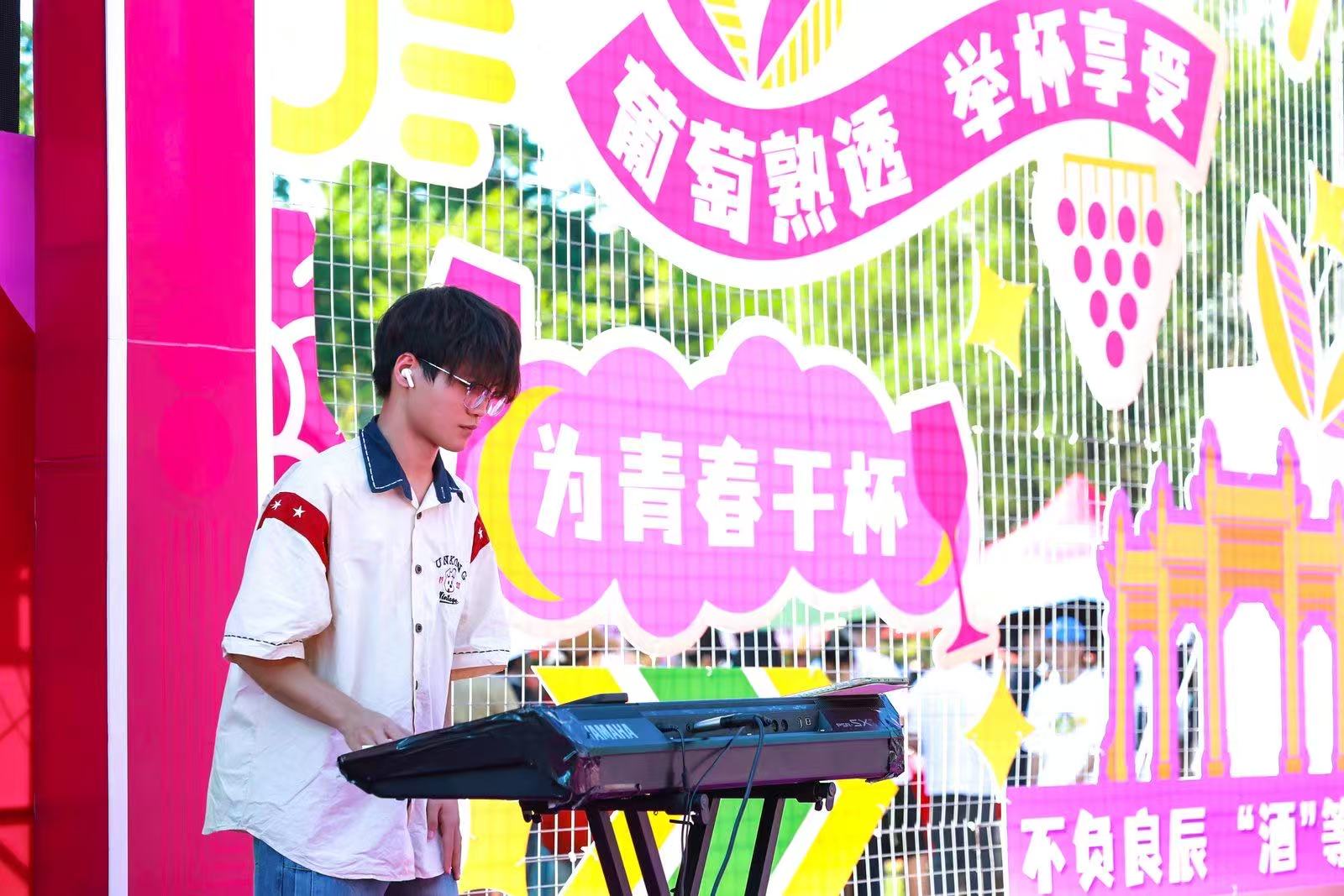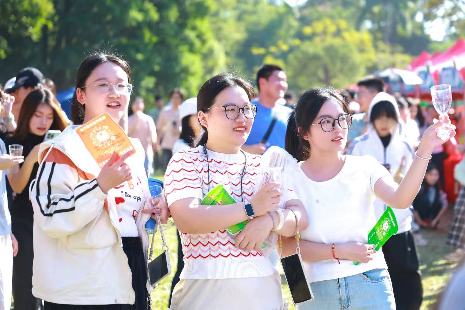 步入園區(qū),紫色葡萄藤拱門氛圍感拉滿,酸甜果香與單寧馥郁交織,混著粵菜燒臘的誘人香氣撲面而來。“天山杯”藝術(shù)創(chuàng)意作品展前,學(xué)生們舉機狂拍葡萄酒主題作品;校友企業(yè)展試吃臺排起長隊,試吃叉剛遞出便被一搶而空;“舉杯賀蘭山—微醺紛玩島”前更是人聲鼎沸,玻璃杯碰撞聲、叫好聲此起彼伏,成為全場最熱門打卡點。