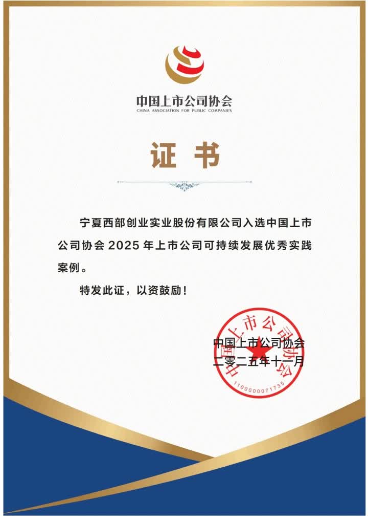 寧夏新聞網訊(記者 楊兆蓮)記者11月21日從西部創業公司了解到,在18日舉行的2025中國上市公司可持續發展大會上,西部創業憑借其在履行社會責任、多維度推進鄉村振興以及構建特色幫扶體系等方面的卓越實踐,成功入選“2025年上市公司可持續發展優秀實踐案例”。這是該公司繼2024年榮獲“上市公司鄉村振興最佳實踐案例”后,在可持續發展領域再獲權威認可,彰顯了其在環境、社會及治理(ESG)領域的持續深耕與突出成效。