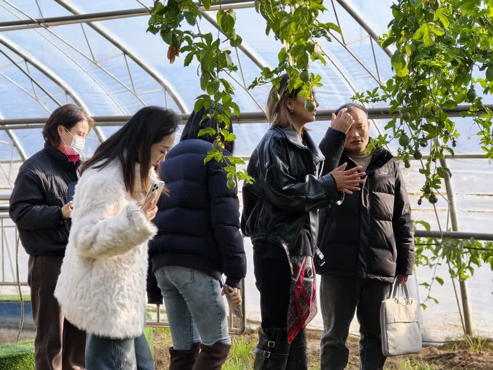寧夏新聞網訊(記者 朱敏 文/圖)11月20日,“石榴花開 籽籽同心”鑄牢中華民族共同體意識網絡主題傳播活動走進青銅峽市葉盛鎮蔣灘村。在農業產業園的大棚里,百香果藤蔓間掛著青澀的果實,香蕉樹寬大的葉片下,一串串香蕉泛著青綠,這些本在南方的熱帶水果,卻在此“安家”。媒體記者和自媒體達人被眼前的景象所吸引。“在西北還沒見到掛果的香蕉樹,這體驗太新鮮了。”內蒙古阿拉善盟融媒體中心記者賀婷舉起手機連拍數張照片。