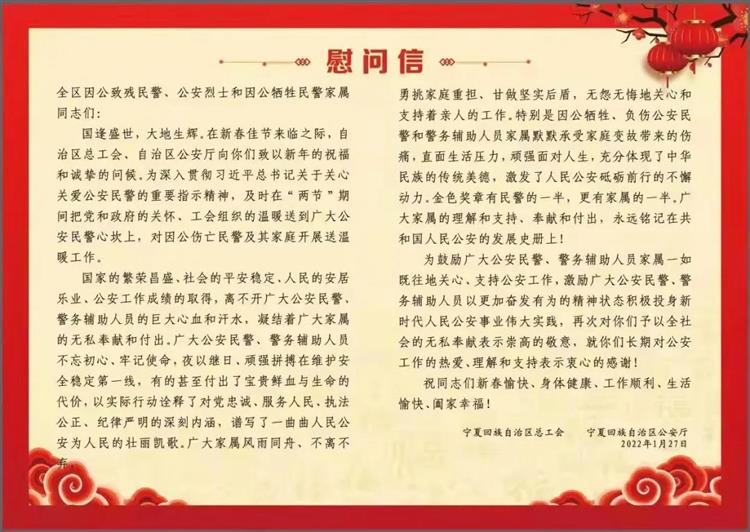 自治區總工會將繼續加強與自治區公安廳的協調對接,進一步完善公安民警困難幫扶慰問等工作機制,努力做好關心關愛公安民警特別是公安烈士、因公犧牲家屬和因公傷殘公安民警工作,為建設平安寧夏貢獻工會力量。
