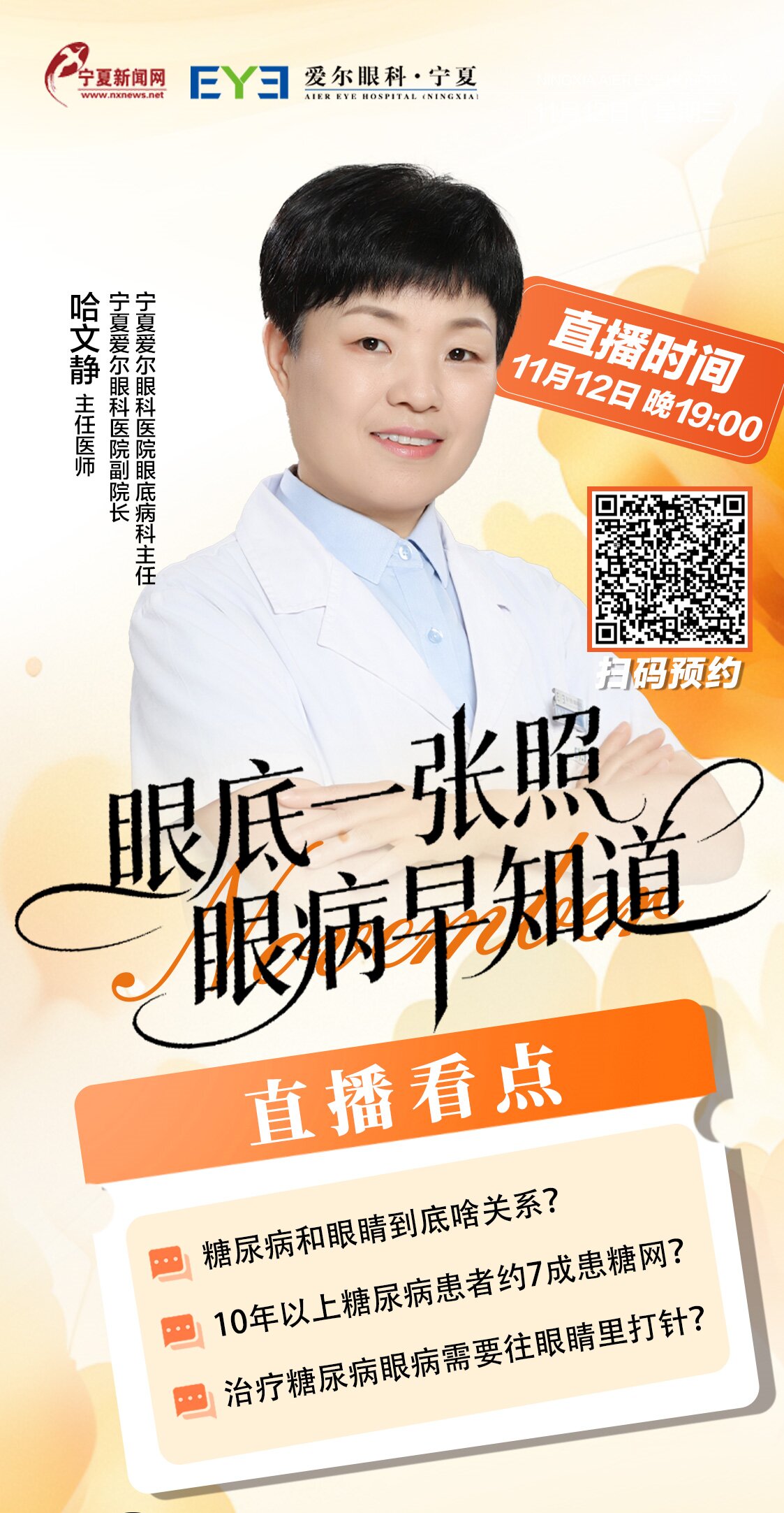 在實(shí)際生活中,大部分患者對(duì)糖尿病眼病的認(rèn)知、治療了解不足。為普及糖尿病患者的愛眼護(hù)眼知識(shí),提高他們的健康醫(yī)療意識(shí),幫助他們遠(yuǎn)離失明威脅,寧夏愛爾眼科醫(yī)院聯(lián)合寧夏新聞網(wǎng)將于11月12日(周三)19點(diǎn)開展公益直播科普活動(dòng)。