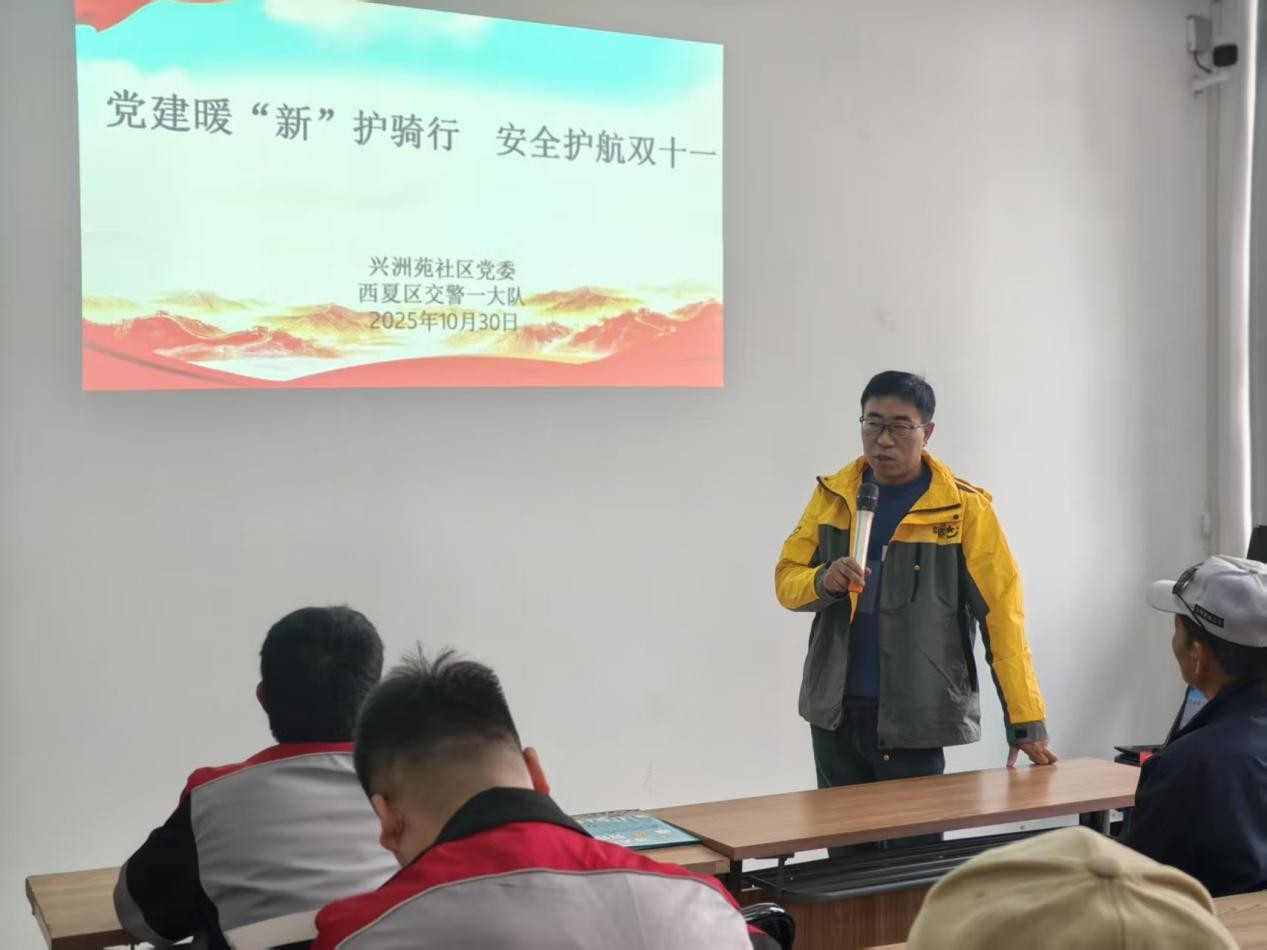 近日,銀川市西夏區(qū)西花園路街道興洲苑社區(qū)以黨建為引領(lǐng),組織開展“黨建暖‘新’護(hù)騎行,安全護(hù)航雙十一”主題活動(dòng),邀請(qǐng)西夏區(qū)交警一大隊(duì)警官走進(jìn)社區(qū),把“安全課”“暖心禮”“健康服務(wù)”打包送到新就業(yè)群體身邊,讓新就業(yè)群體感受到黨組織的關(guān)懷與溫暖。